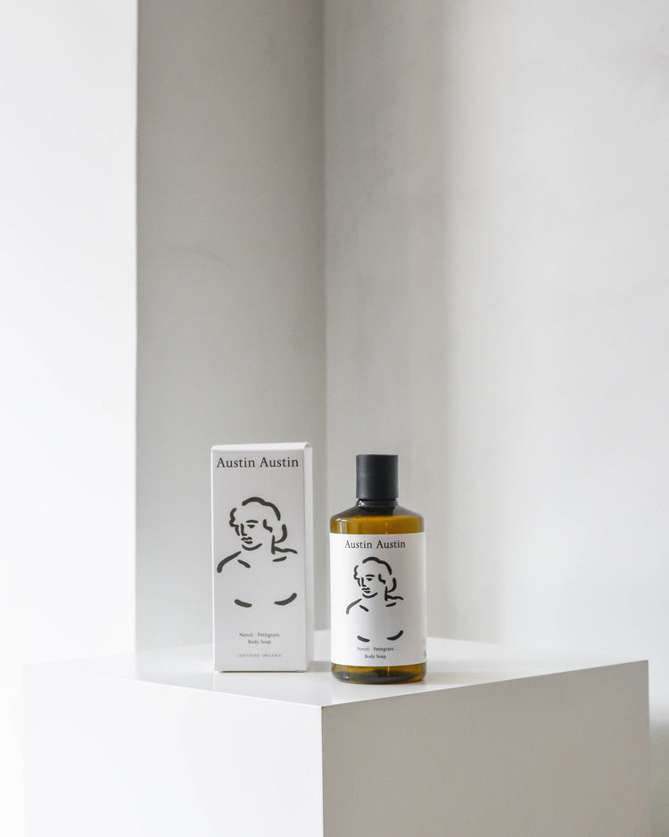 Every bottle of Austin Austin is of exquisite quality, a canvas for artwork on the bathroom shelf and certified Organic by the Soil Association and COSMOS.
