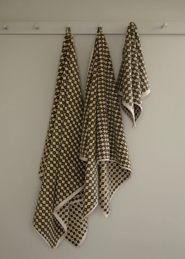 Designed by Alessandra Williams for Autumn Sonata, the reversible jacquard weave in olive and ecru is crafted from plush, double-looped cotton for generous absorbency, refined texture, and daily function with subtle artistry. Part of a limited collaboration inspired by southern Italy’s architectural landscapes, the Hanna print is a quiet study in geometry and place.