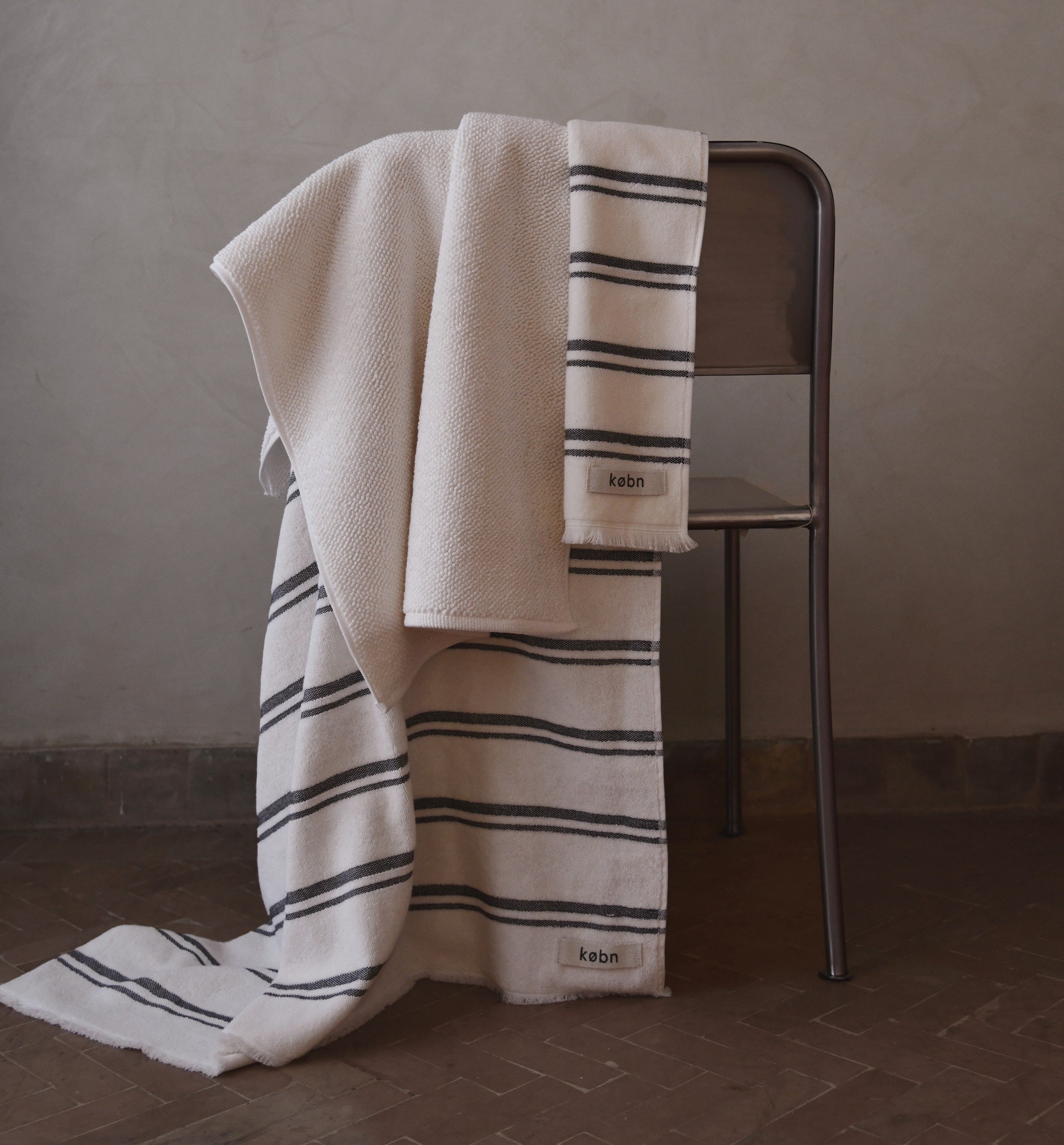 Every detail of Købn is thoughtfully considered. The towels are reversible, with one side terry and one side plain weave, a finish more akin with interior fabrics. They feature raw edge fringing and drop pile stripes. The towels are crafted by a family-owned mill in Denizli, Turkey, a region synonymous with high quality textiles, ensuring impeccable fabrication and ethical production.