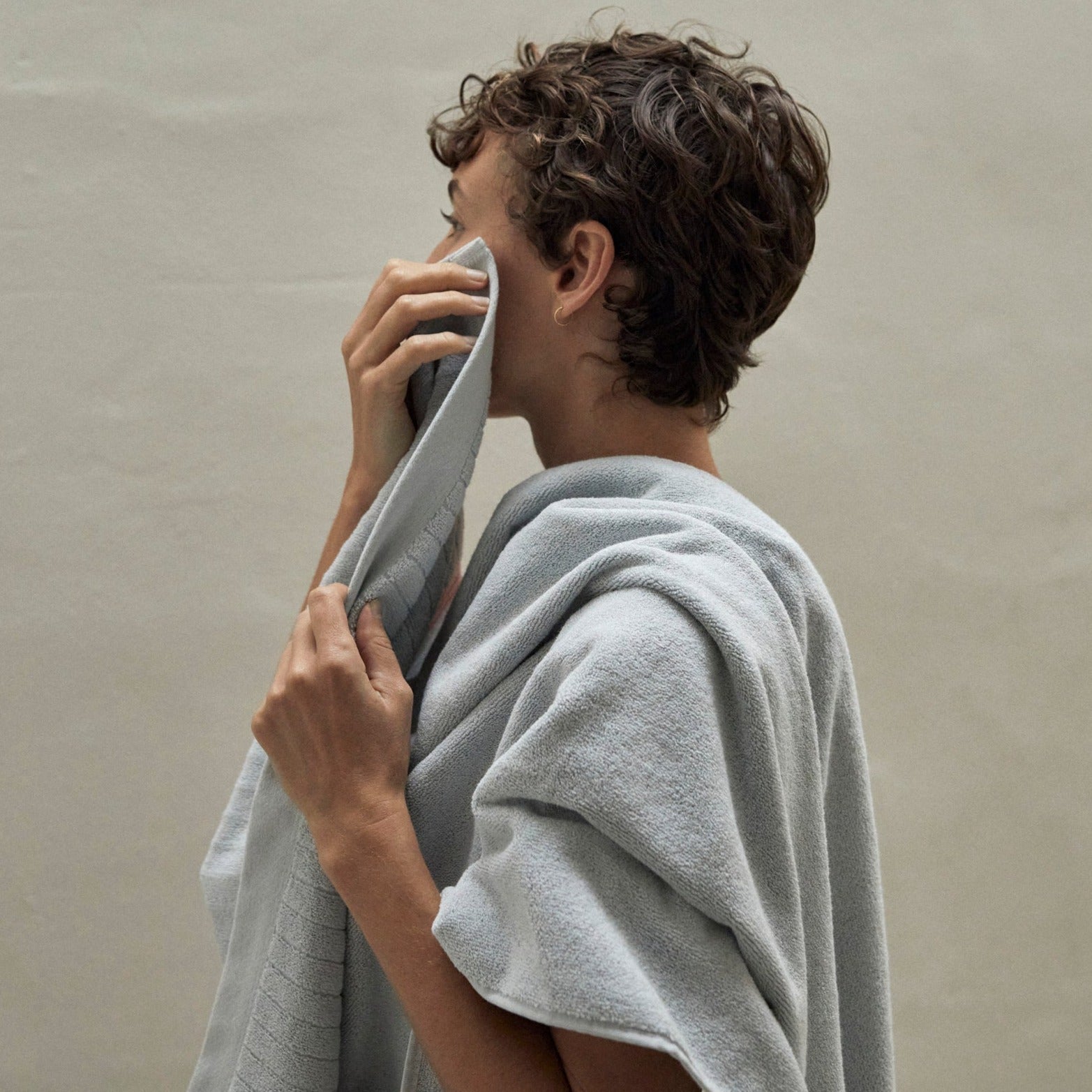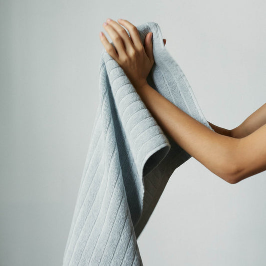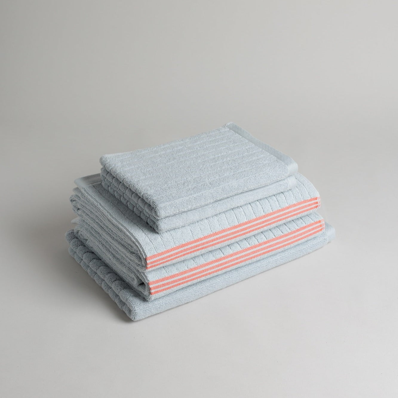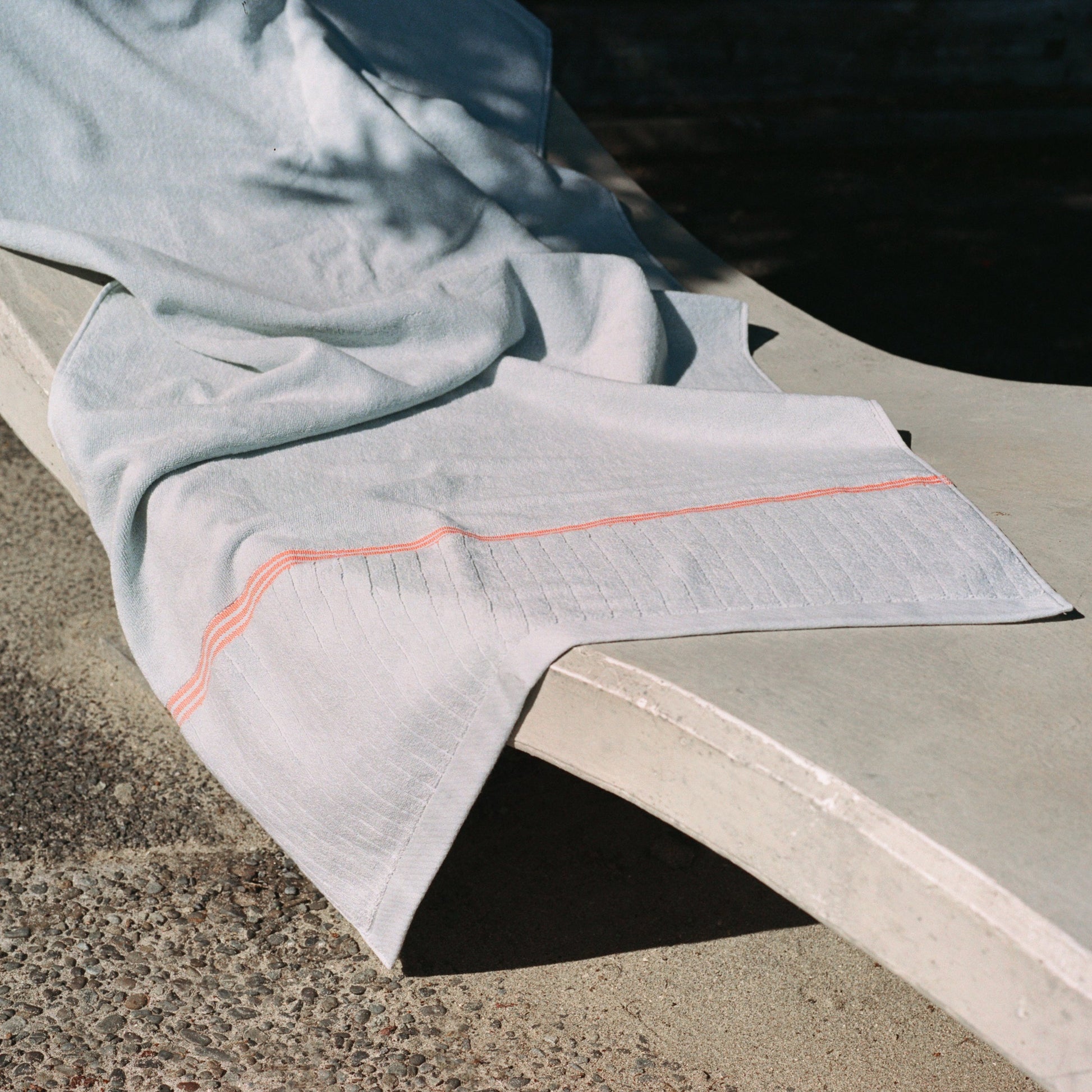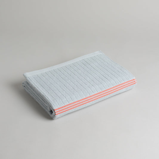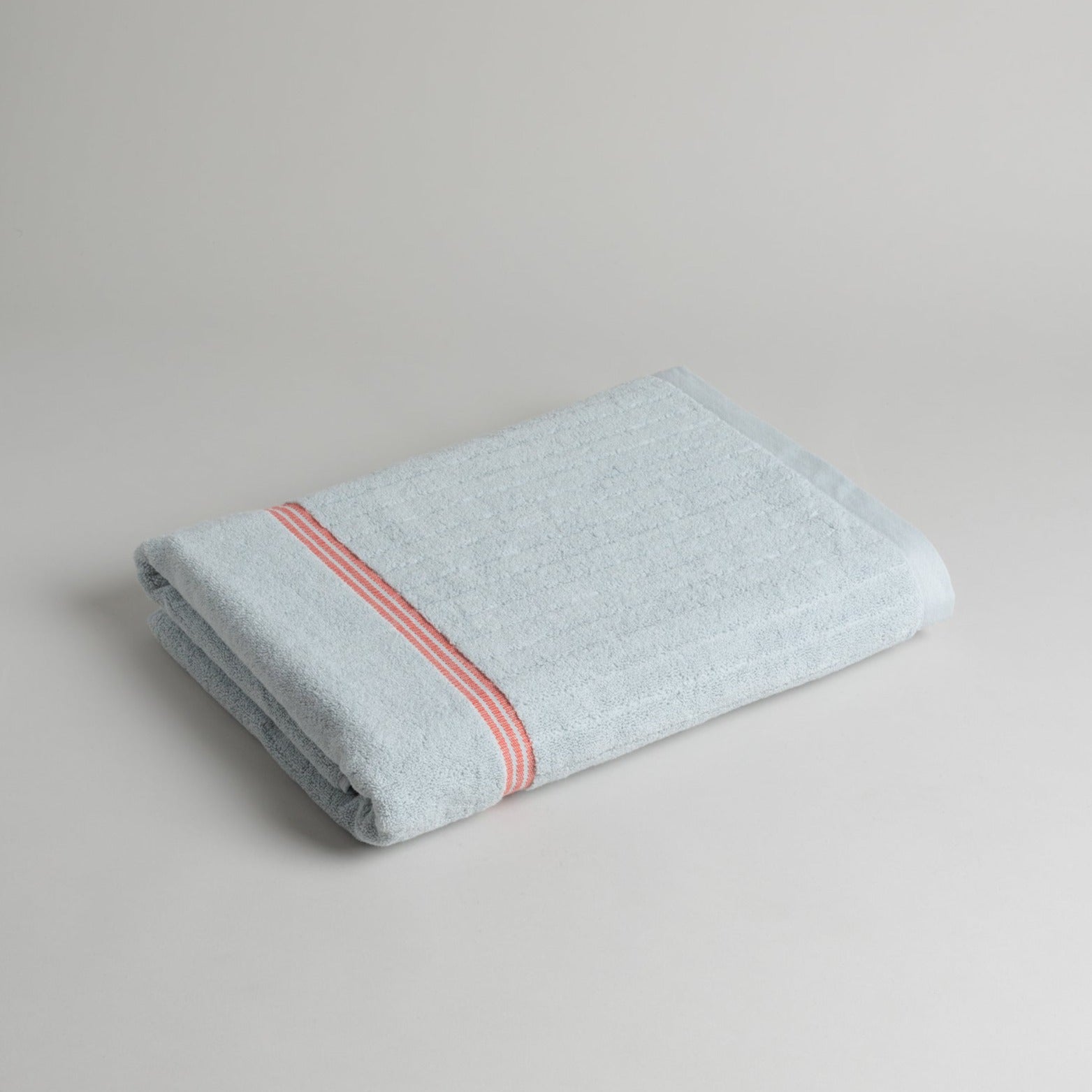 100% Organic Cotton bath sheet by Baina. Produced in a cool lake blue colour featuring a contrast paloma red stitch detail and a single sided ribbed panel. Luxuriously soft, a simple way to elevate your daily bath time routine. Pairs nicely with the HAYES BATH TOWEL.