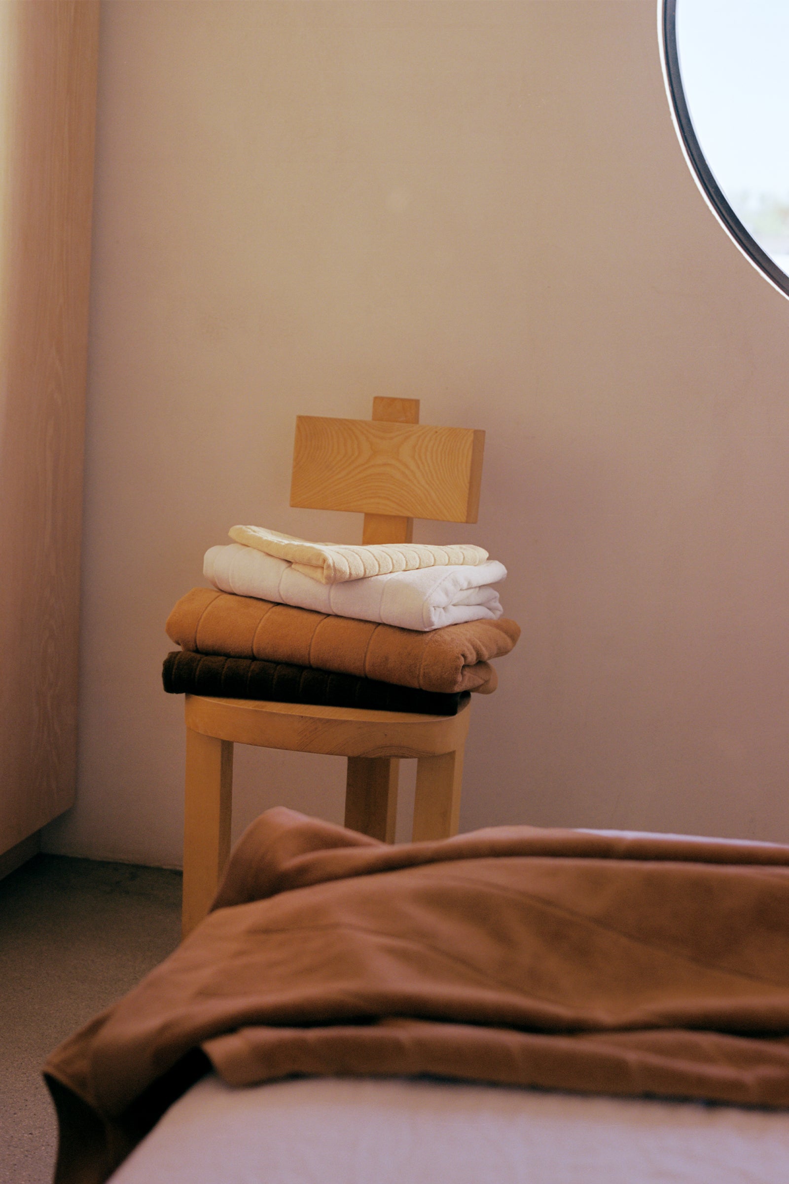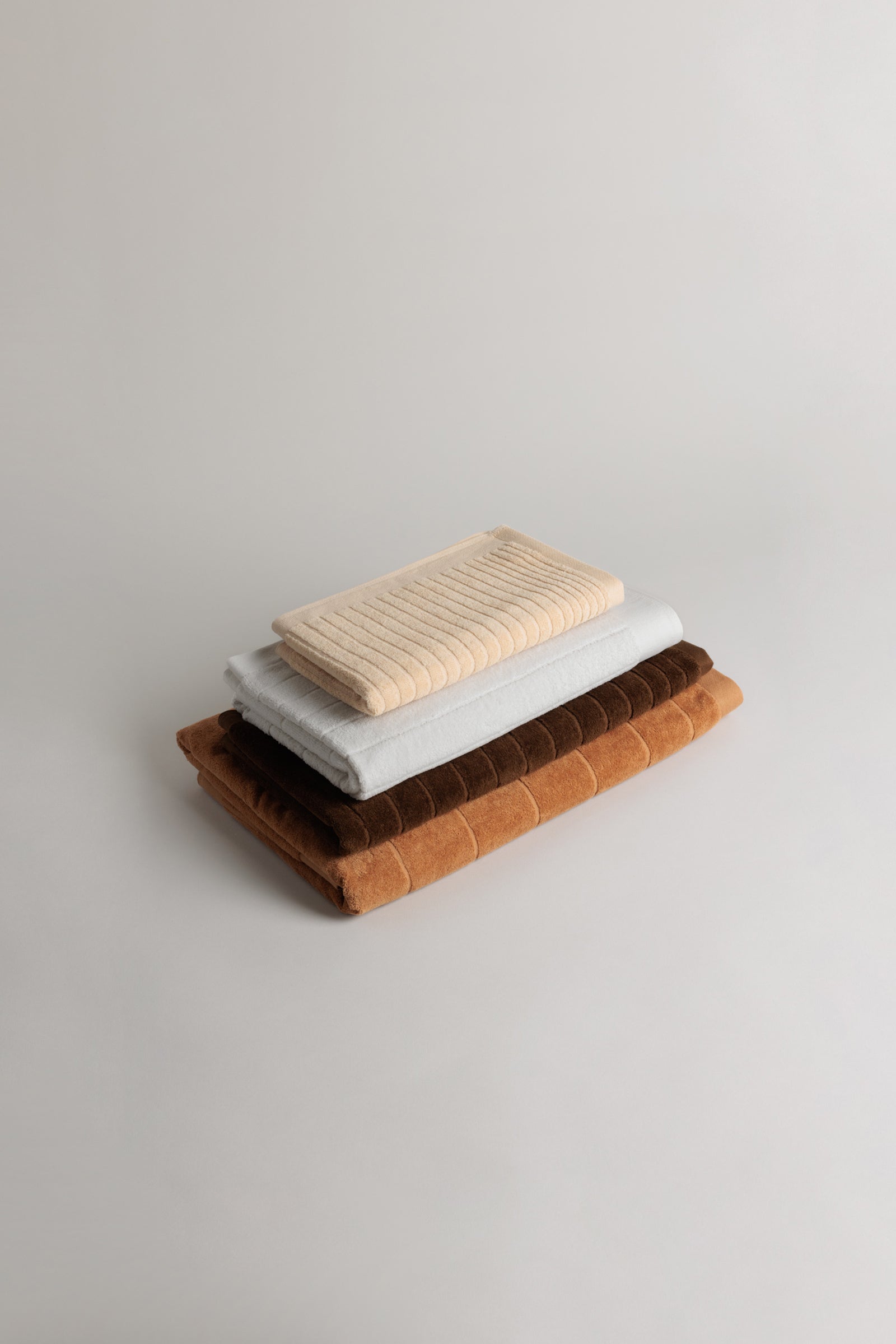 The collection is realised in a tonal colour palette of Stone, Sand, Rust and Bark. Clean, recurrent lines, in varying weights, form a linear pattern on each towel. A first for BAINA, the UMBRA collection is crafted entirely from cut pile, organic cotton velour, resulting in a plush texture and velvety surface for enhanced softness. The application of a jacquard technique contrasts bold raised lines against lighter tones of the base fabric. These varying tonal gradients evoke a sense of depth whilst referencing the effect of shadow,