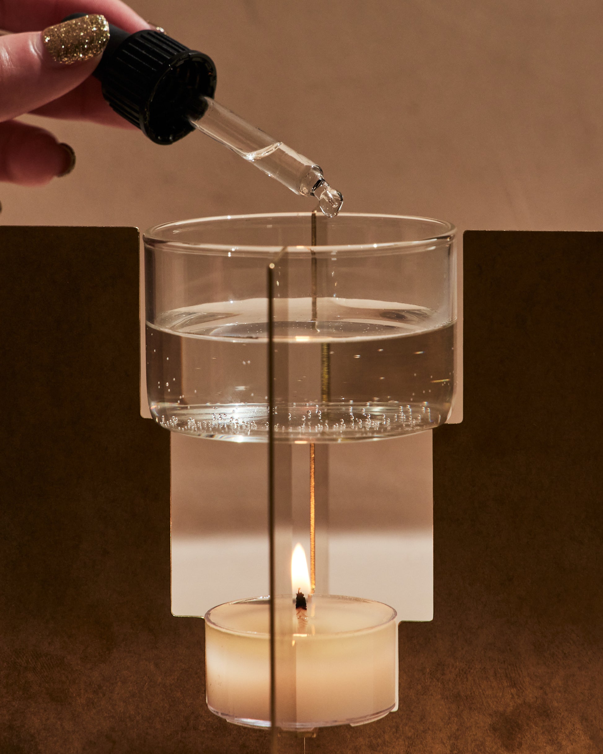 This is a candle-type oil warmer (air freshener) co-produced jointly with BP. As the tea light candle heats up the glass, the fragrance oil or essential oil will begin to vaporize, spreading a pleasing aroma around the room. When the glass warms up with the tea light candle, the fragrance expands into the air by volatilization of fragrance oil.