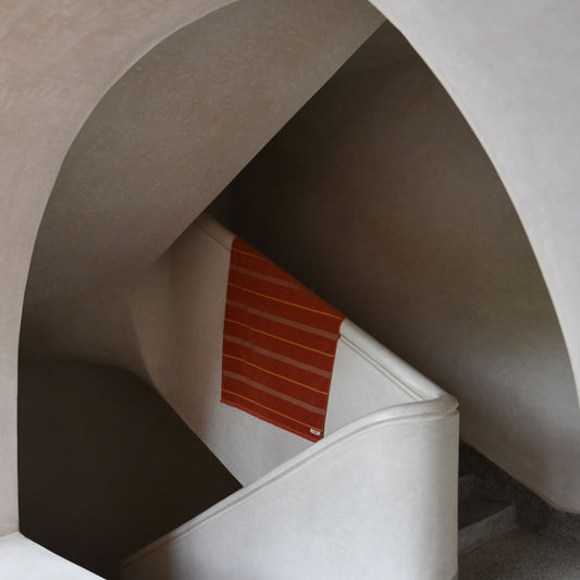 Inspired by the vibrant colours and traditions of Marrakesh, Citrus Terry with highlight stripes in Walnut, Blush and Caramel with details in raw fringing.