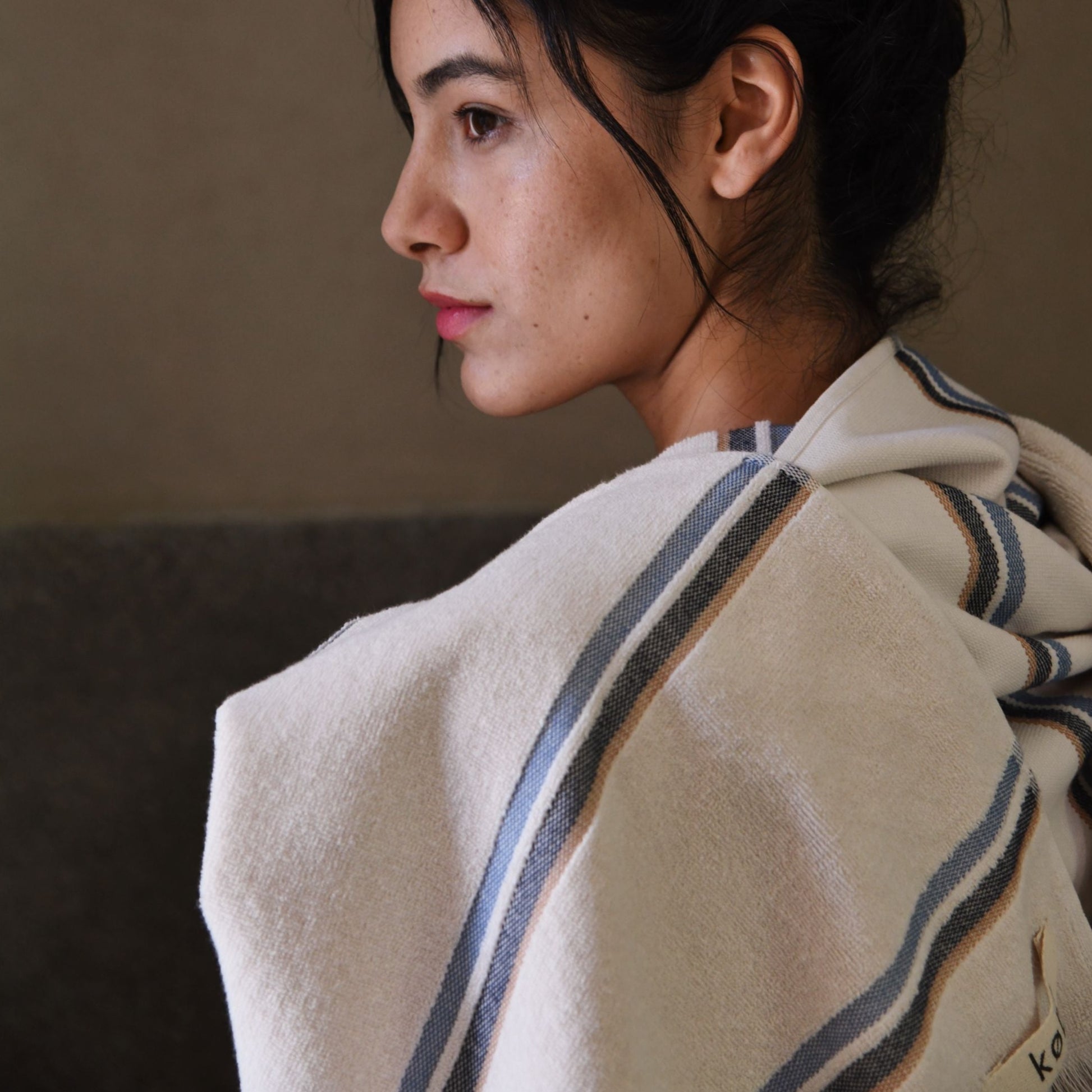 Inspired by the vibrant colours and traditions of Marrakesh, Ecru features stripes in contrasting Azure, Deep Navy and Tan with details in raw fringing.