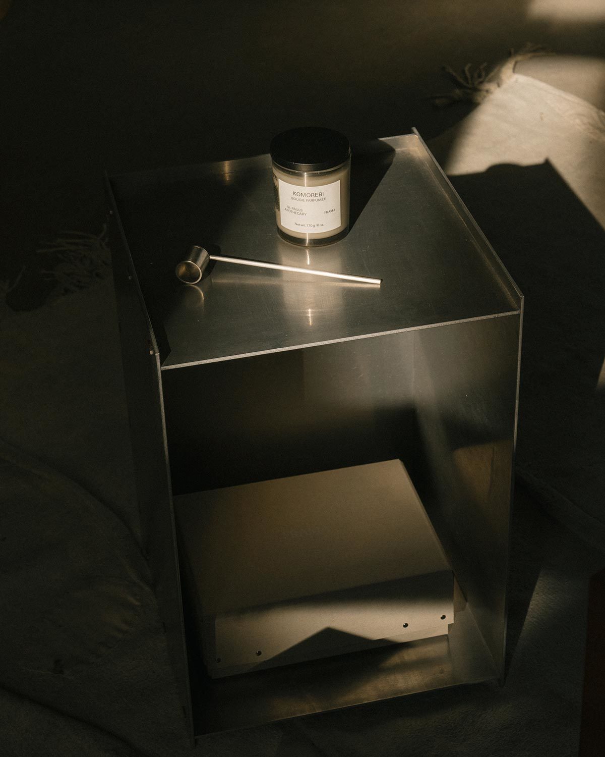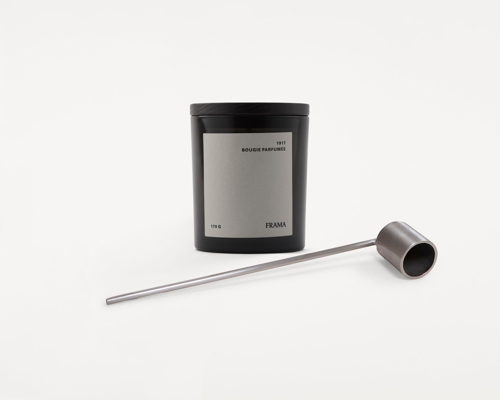 Materials: Scent diffusing wax candle in black tinted glass with a wooden lid, the stainless steel snuffer will patina gracefully over time, box made from waste paper and dyed naturally produced locally in Copenhagen in a factory building from 1909