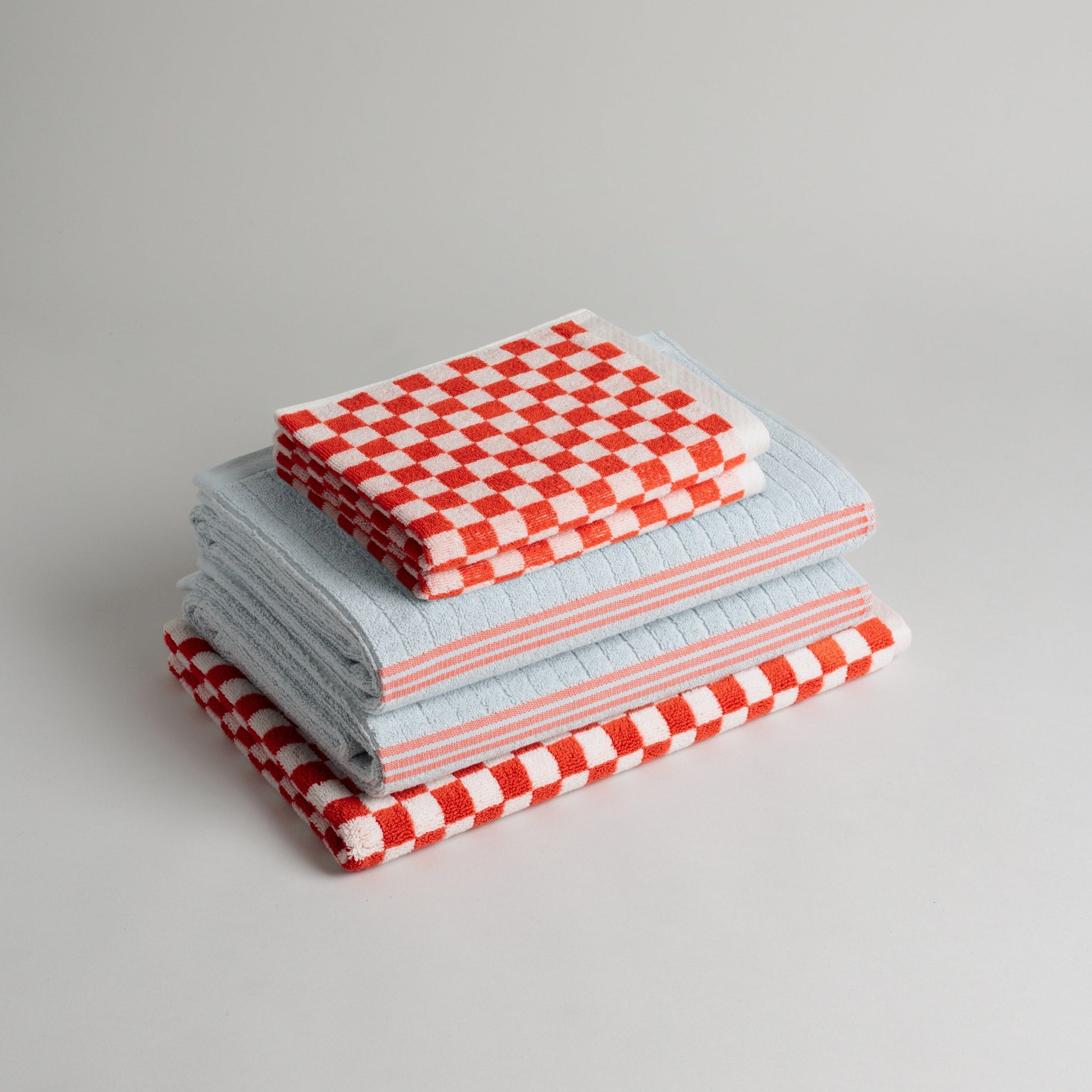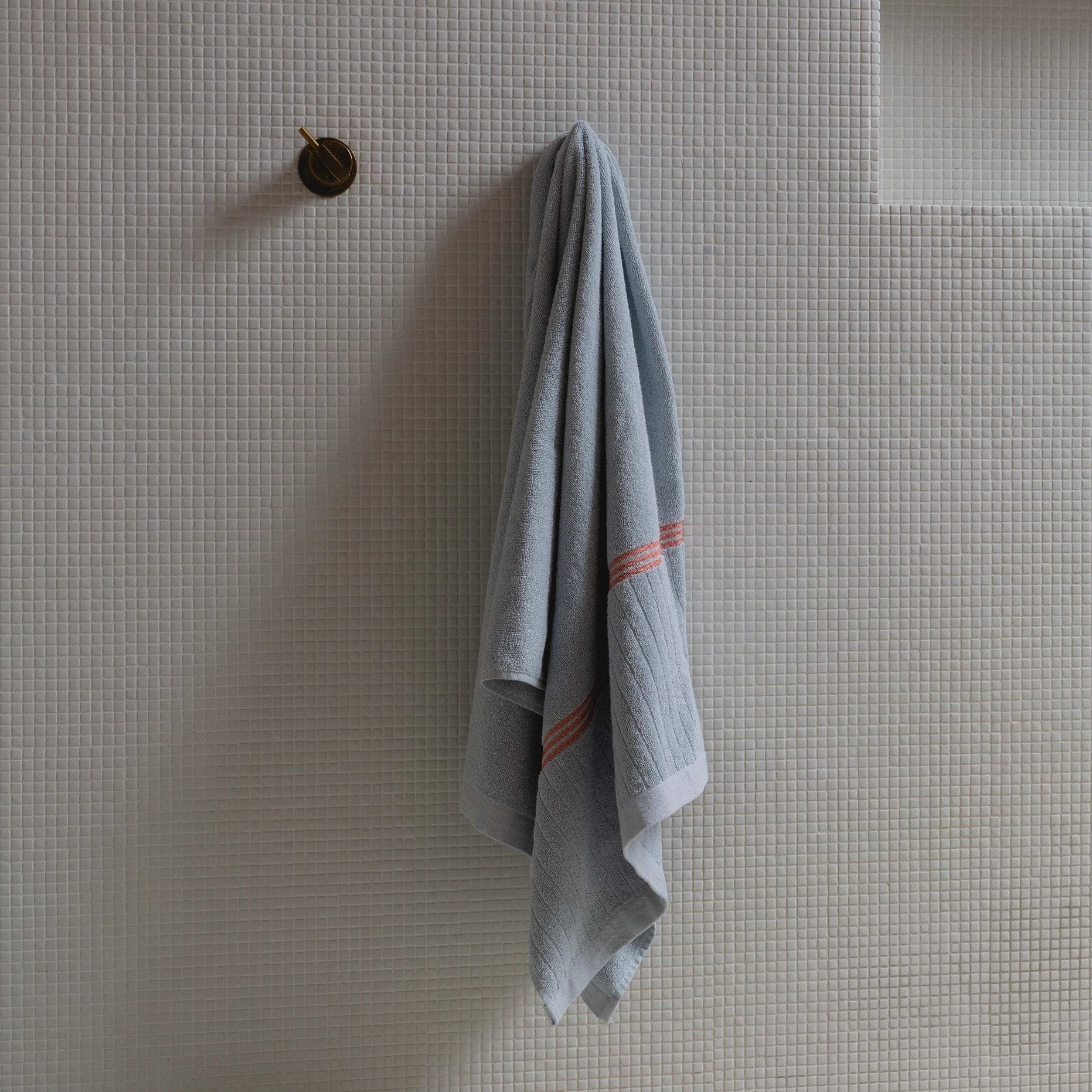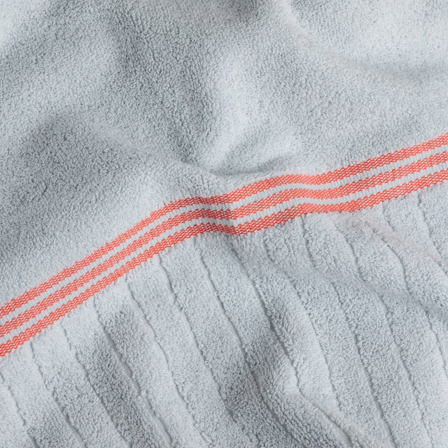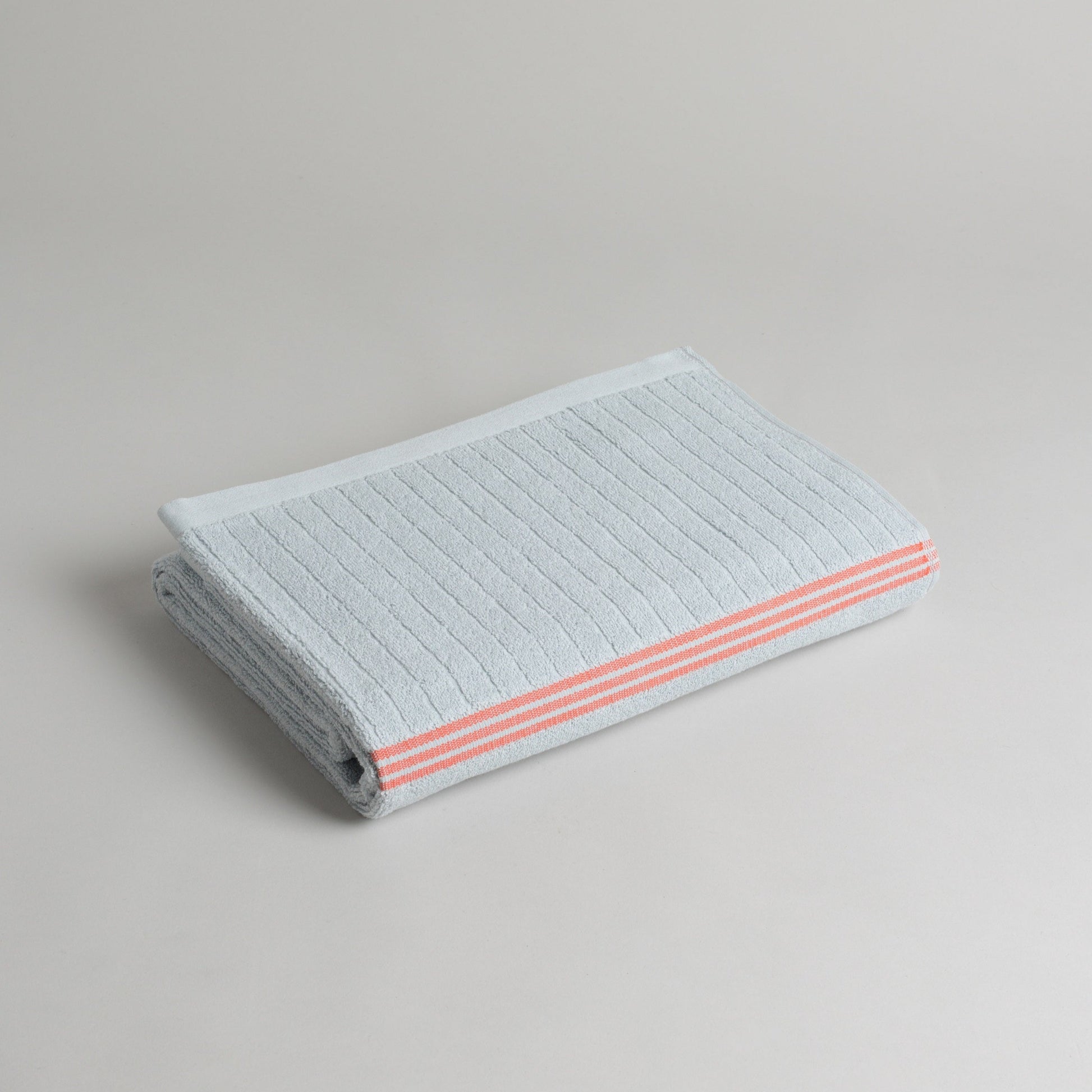 100% Organic Cotton bath towel. In a cool lake blue colour featuring a contrast paloma red stitch detail and a single sided ribbed panel. Luxuriously soft, a simple way to elevate your daily bath time routine. Pairs nicely with the TAMA HAND TOWEL.
