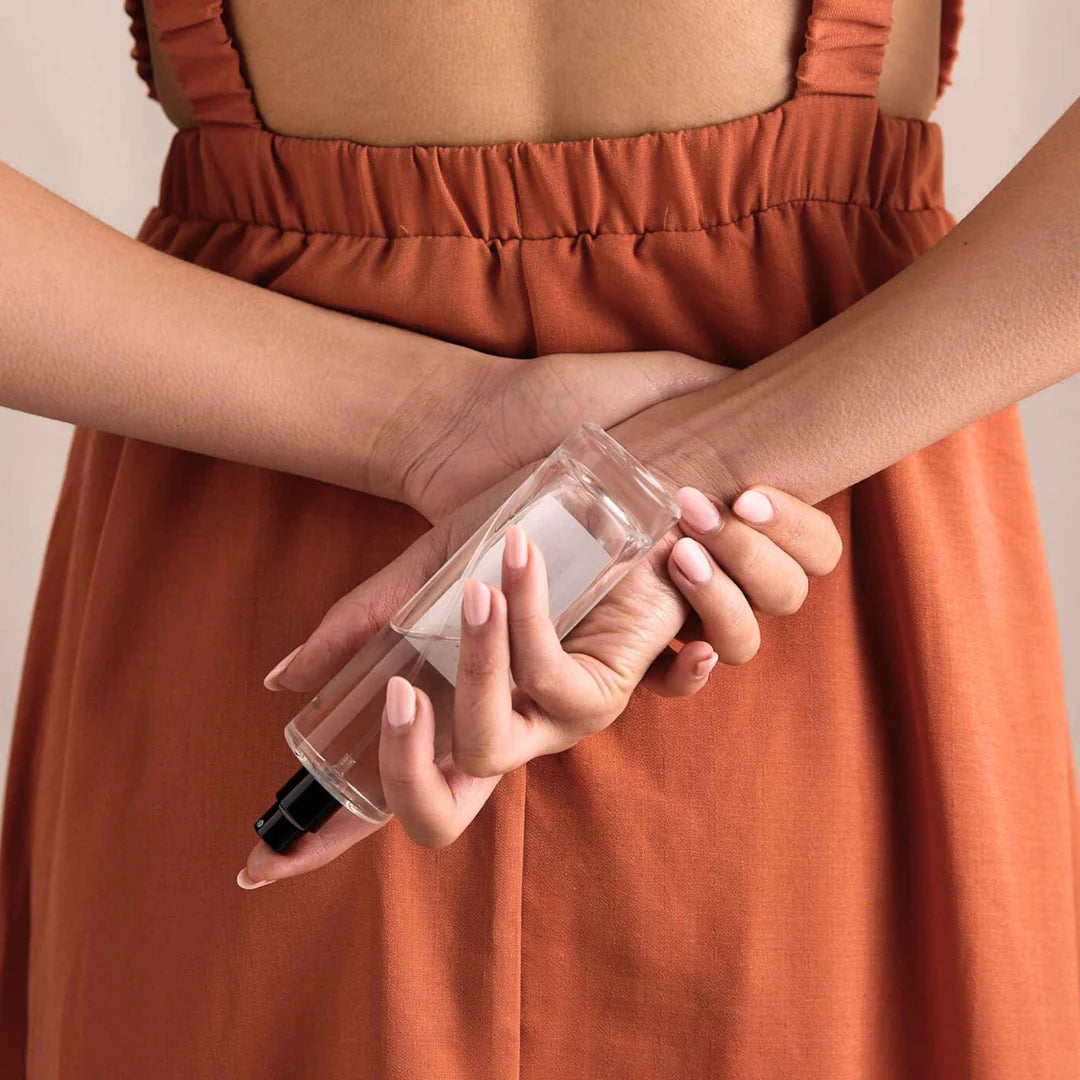 Transparent glass featuring minimalist labelling and ultra-fine mister. Boxed in FSC-certified, recyclable cardboard with a subtle embossed finish.