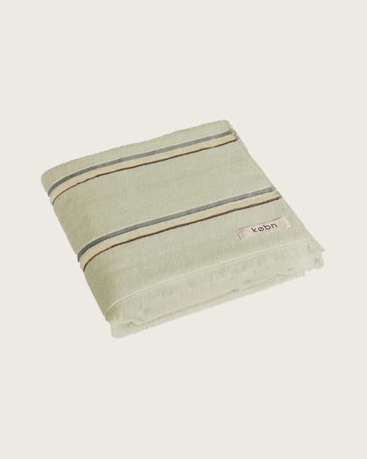Sized at 50 x 70 cm, it features Købn’s signature minimal stripe detailing and a raw edge fringe finish. Whether styled solo or layered with matching tones, the hand towel adds a considered touch to even the smallest spaces.