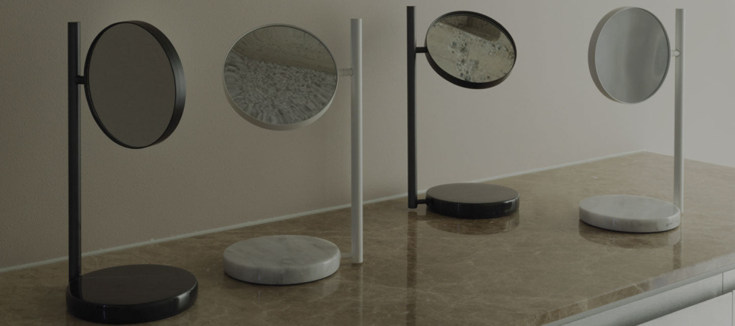 Pose Mirror is a beautiful and practical object for everyday use. A round, solid marble base lends sturdiness to the design and offers a decorative platform for jewellery or other personal items. Pose Mirror features a regular mirror on one side, and a 3x magnification mirror on the other. The 360° swivel design allows for easy switching between the two mirrored sides.