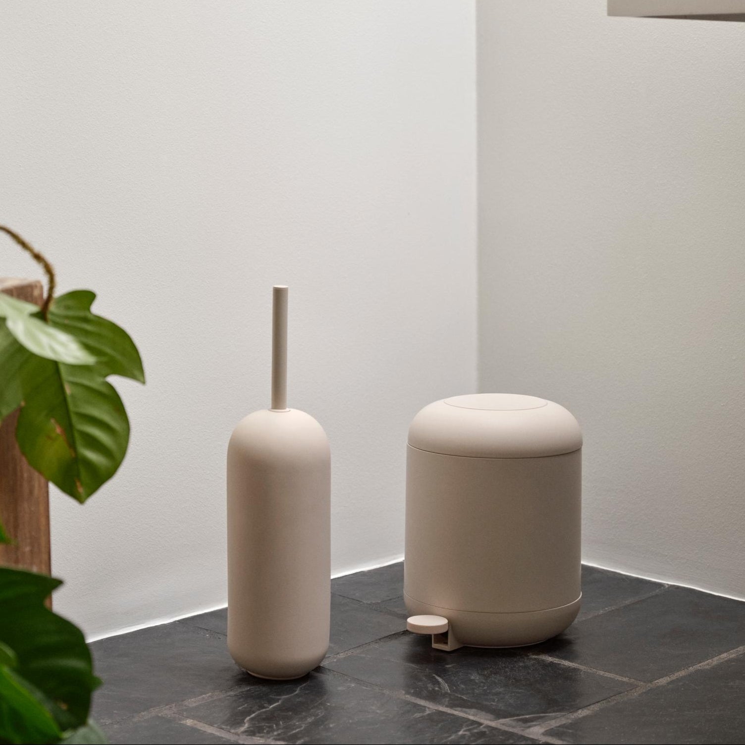 The 4-litre plastic pedal bin has a chubby cylindrical body. The look is charmingly complimented by two circle shapes. One on top of the lid as a decorative detail; the other in the shape of a small round pedal at the front.