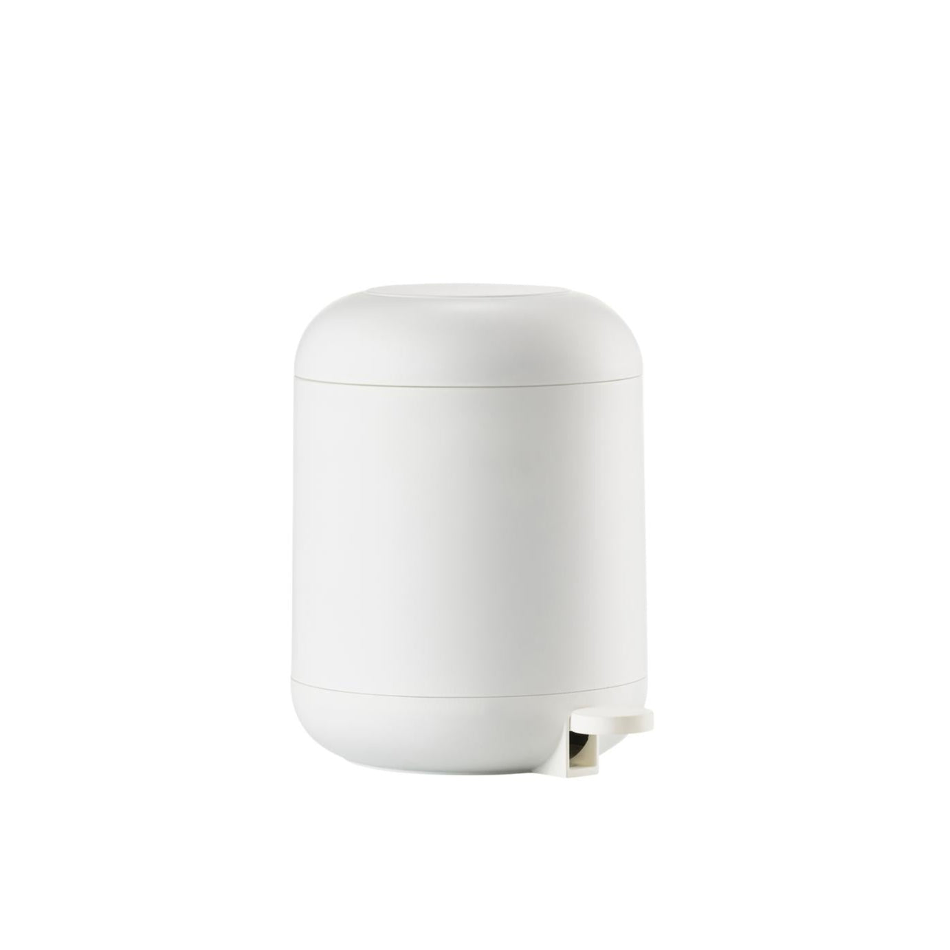 The 4-litre plastic pedal bin has a chubby cylindrical body. The look is charmingly complimented by two circle shapes. One on top of the lid as a decorative detail; the other in the shape of a small round pedal at the front.