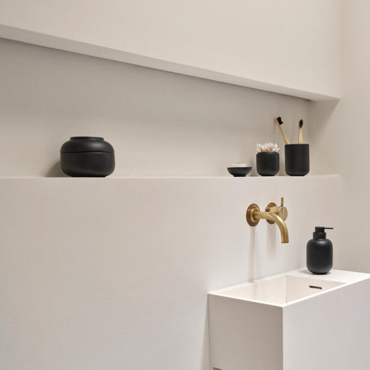 For the washbasin, you’ll find a cute cylindrical soap dispenser with a neat little pump head. It matches the classic toothbrush tumbler, which, like the other designs in the range, is made of stoneware. The weight of the stoneware and the round base keep the toothbrush tumbler sitting securely on the vanity top. You can buy several and use them for make-up brushes, shaving equipment or other everyday favourites that you want to keep handy.