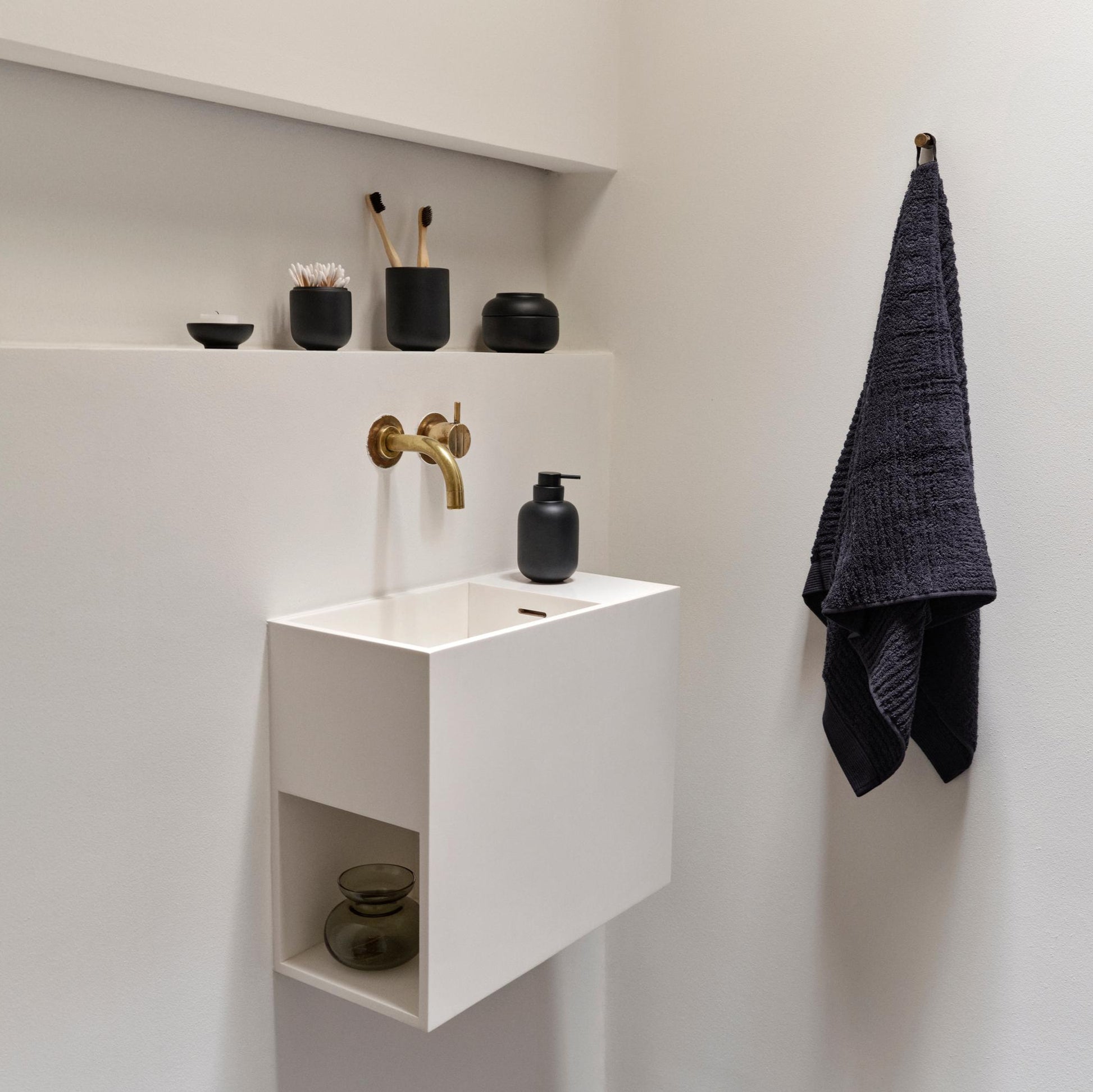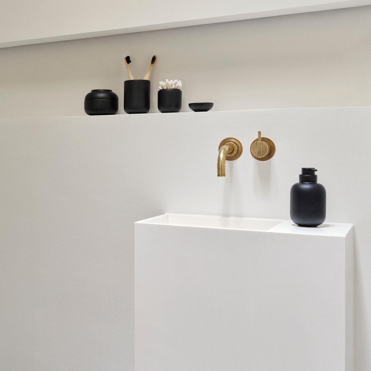 For the washbasin, you’ll find a cute cylindrical soap dispenser with a neat little pump head. It matches the classic toothbrush tumbler, which, like the other designs in the range, is made of stoneware. The weight of the stoneware and the round base keep the toothbrush tumbler sitting securely on the vanity top. You can buy several and use them for make-up brushes, shaving equipment or other everyday favourites that you want to keep handy.