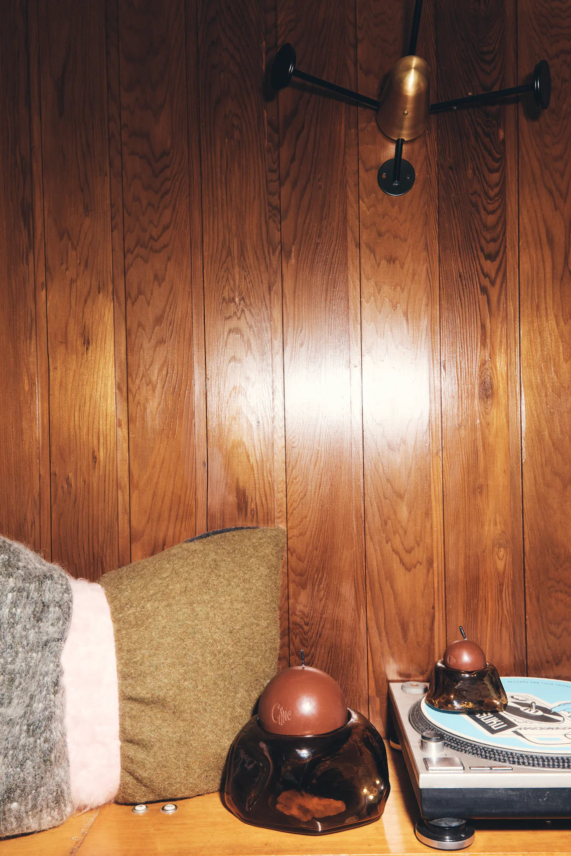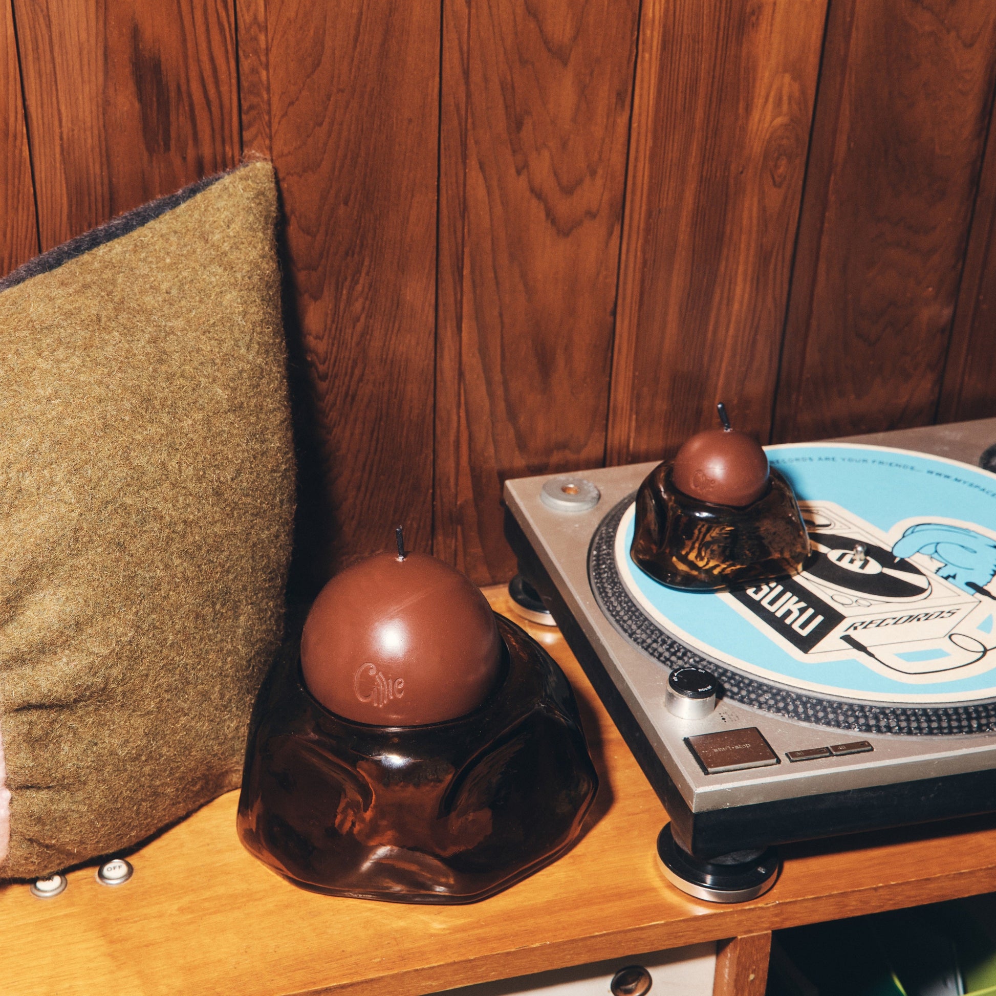 The Skivvy Candle collection exhibits a hand sculpted glass vessel and scented candle. The shape itself is inspired by the warmth of a knitted skivvy sweater created by hand draping fabric forms. Each recycled glass piece is mouth blown in Uttar Pradesh, India and sphere candle is hand poured in Sydney, Australia.