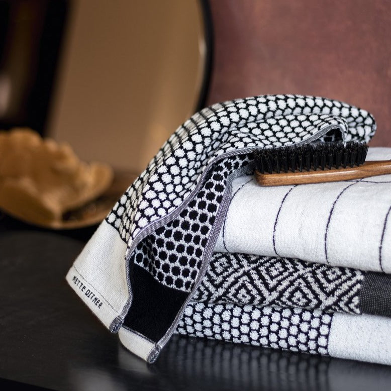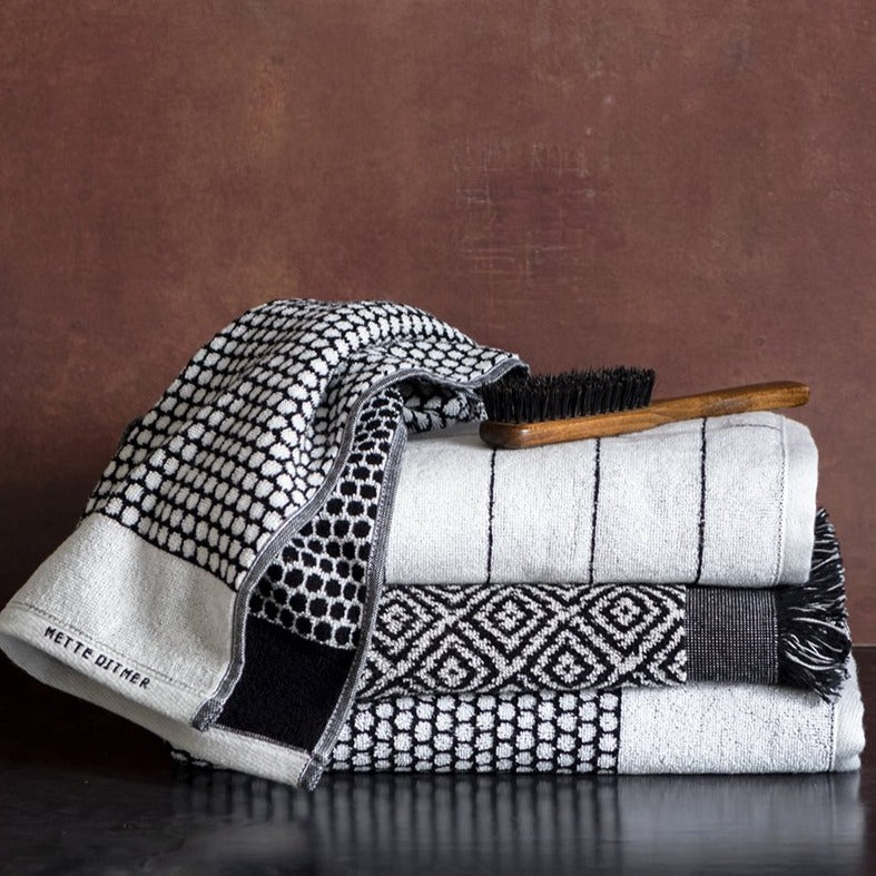 The TILE STONE towels have a simple design with flimsy black stripes that are reminiscent of the classic tile pattern. TILE STONE has a graphic expression with undertones of a retro element that complements bathrooms in a simple, Nordic style. Mix and match with towels in the designed GRID, and create dynamism by mixing the graphic patterns. TILE STONE is created in 100% cotton, OEKO-TEX® 100-certified , which gives the towels a unique softness that is maintained wash after wash.
