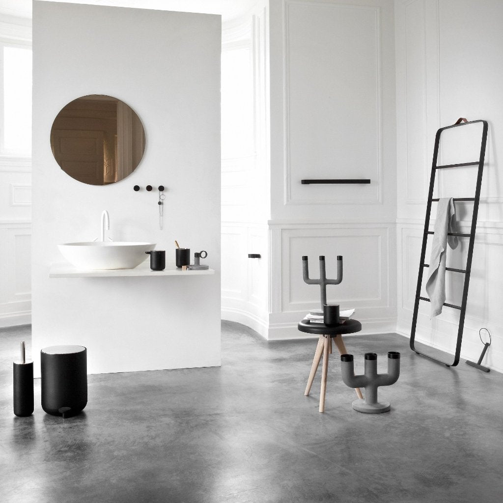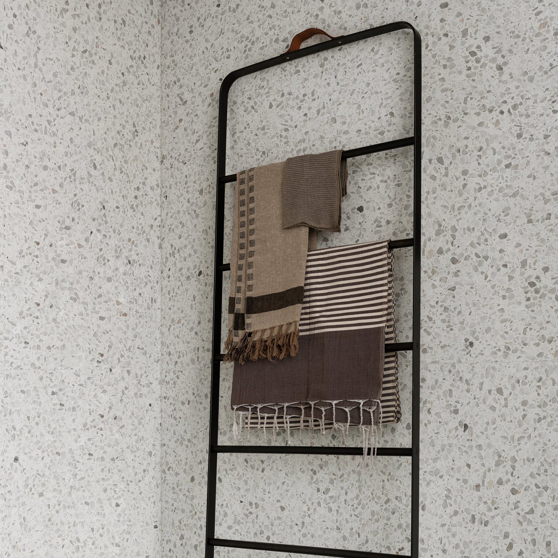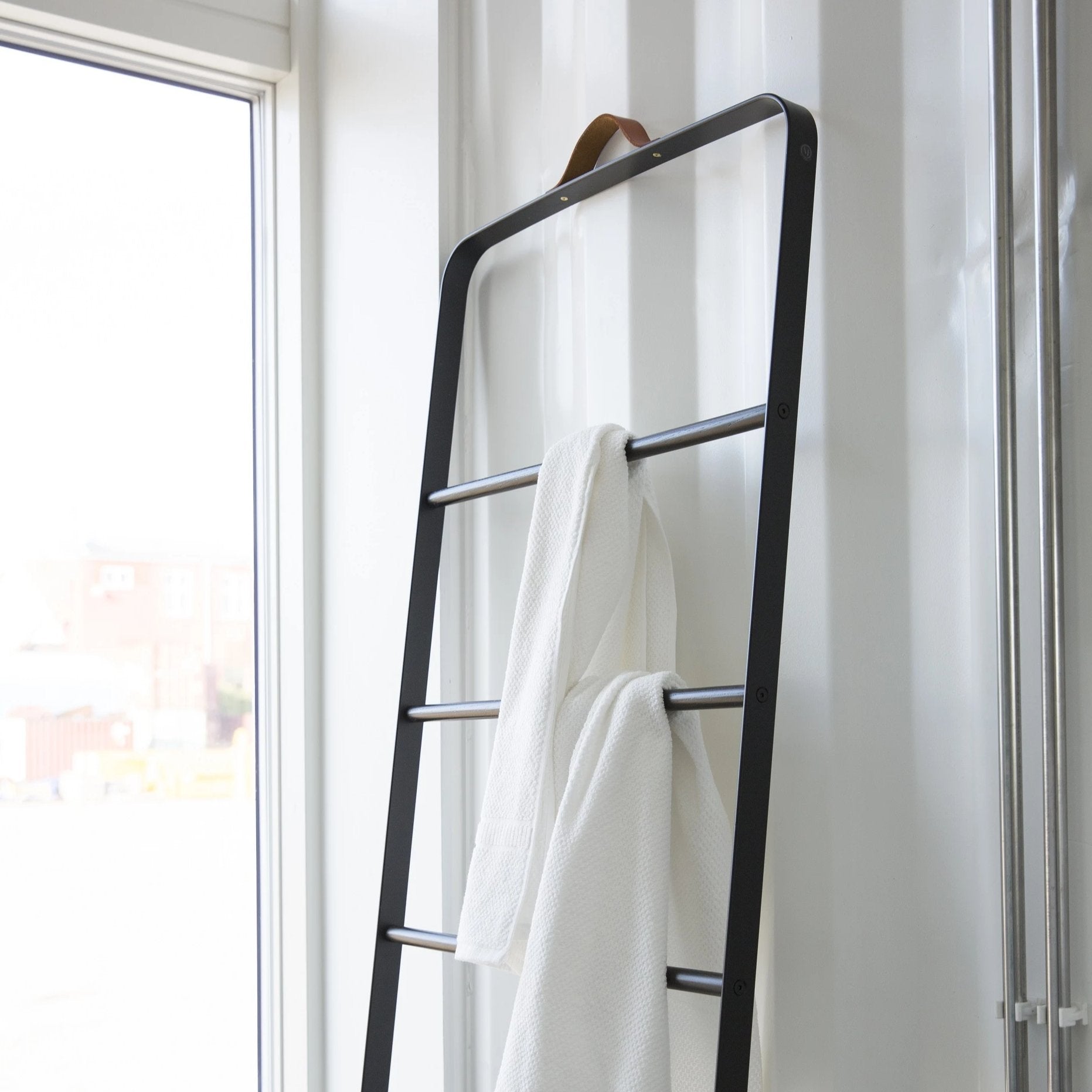 The Towel Ladder is an informal and flexible piece of furniture made for storing towels and accessories in the bathroom - clothes in the bedroom - or scarves and coats in the hallway. It’s easy to move around the house and the leather strap at the top almost makes it look like an oversize suitcase, that you can lift and take anywhere.