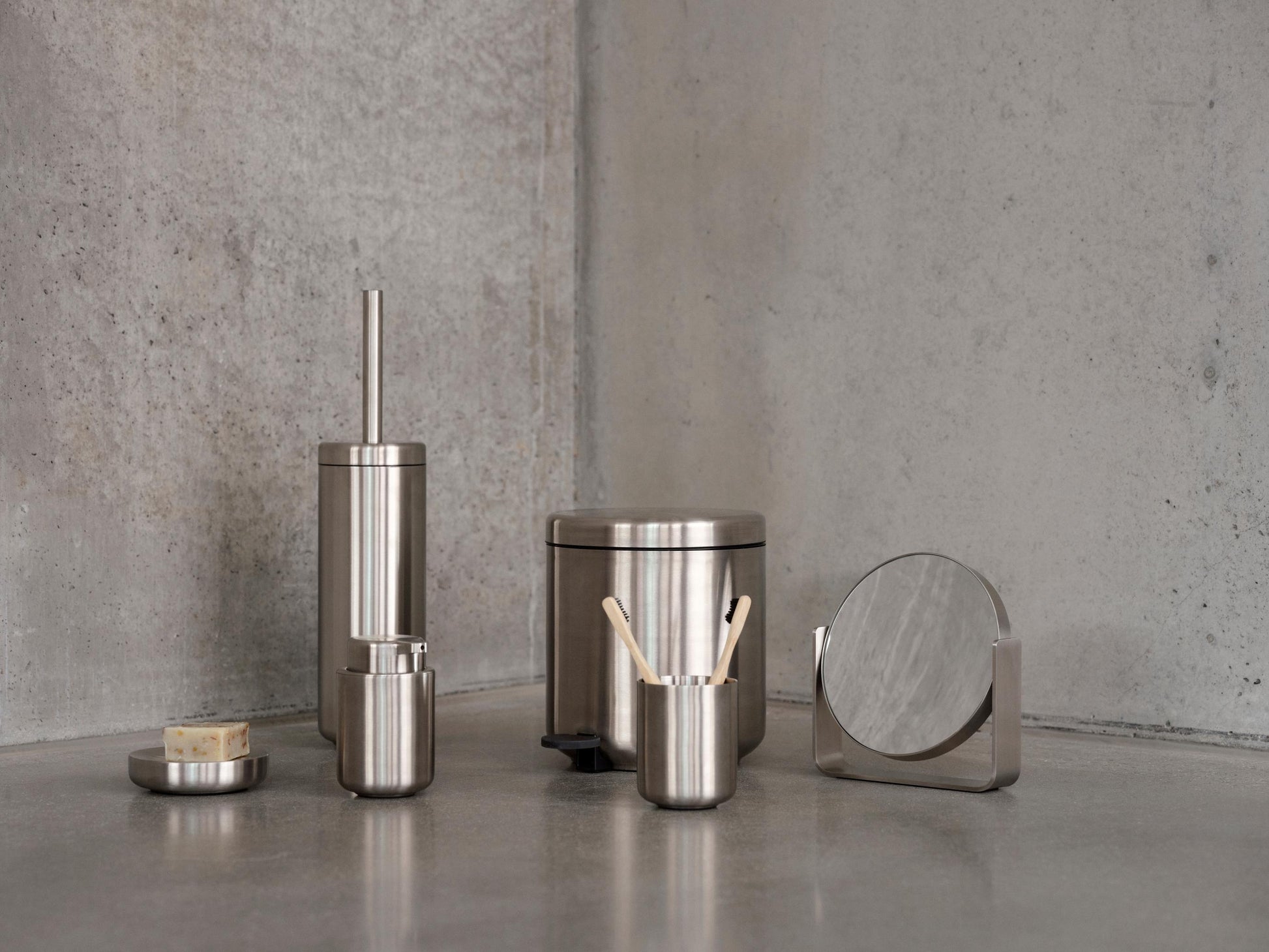 The soft organic shapes contrast beautifully with the stylish, cool steel of the range, which has been created in collaboration with the VE2 design team. At floor level, the range offers a small pedal bin and a toilet brush in a cylindrical holder.