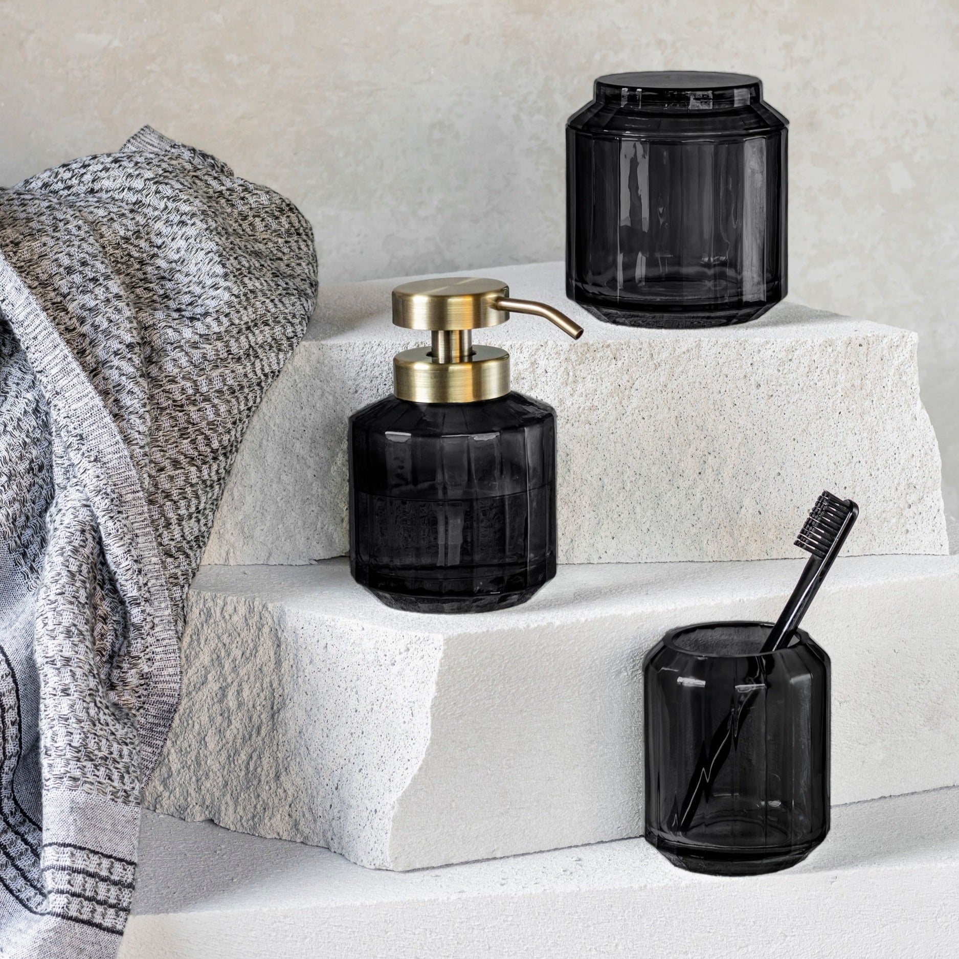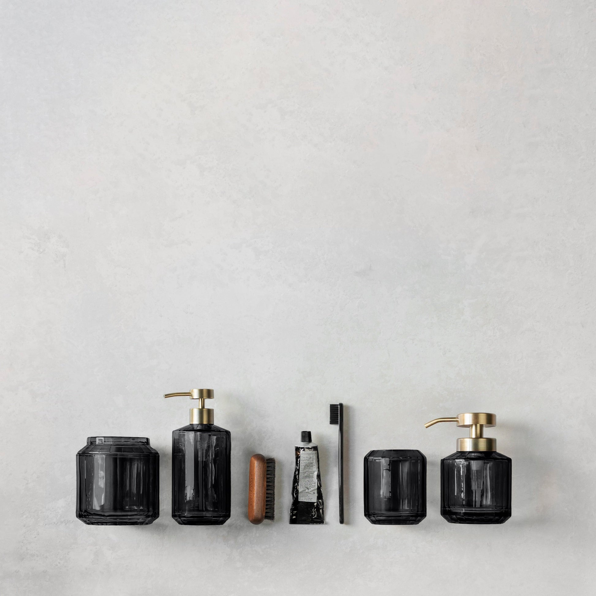 The glass series VISION is an expressive series for the bathroom, made of coloured glass. The characteristics of the series are highlighted by the facets of the glass, which give a beautiful expression when they refract the light. Bring exclusivity and a spa atmosphere into the bathroom with the VISION series, which is available in three colour variants. The 2-in-1 jar is perfect in the bathroom for cotton pads and cotton swabs. The lid can also be used as a fine bowl for jewellery or for a block candle to create the perfect spa atmosphere. Mix and match with high and low dispenser in the same series.